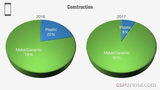 机身材质方面,现在金属/玻璃机身已经成为主流,去年金属/玻璃机身的机型占比高达92%,塑料机身的机型仅剩8%。