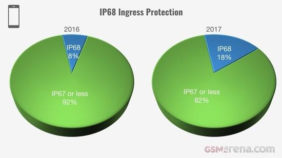 此外,手机的防水性能受到重视,去年已经有18%的手机支持IP68级防尘防水。