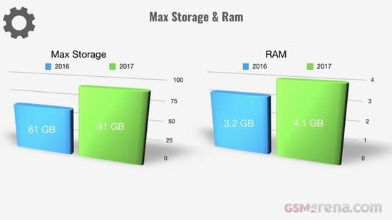 内存方面,运行内存已经普遍达到4GB以上,而主流闪存由64GB翻番到了128GB。