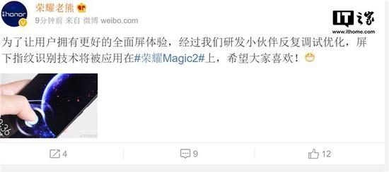 继9月14日微博评论确认荣耀Magic2将配备AMOLED屏幕之后,荣耀业务部副总裁(产品)@荣耀老熊,又在微博中首次正式曝光荣耀Magic2屏下指纹识别操作高清大图,由此正式确认荣耀Magic2将会搭载屏下指纹技术,一时间引起网友热议,至此,荣耀Magic2再露冰山一角。