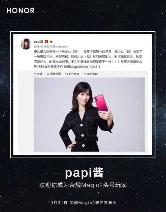papi酱的“美少女”自拍更是坐实荣耀Magic 2拥有6摄配置的实锤,可以看到papi将手中的荣耀Magic 2背后,“AI CAMERA”字样变成了“AI VISION”,是否意味着荣耀Magic 2的AI相机有更多功能加入,十分值得期待。同时一段微博预热视频的放出,更引起粉丝们的热烈反应。