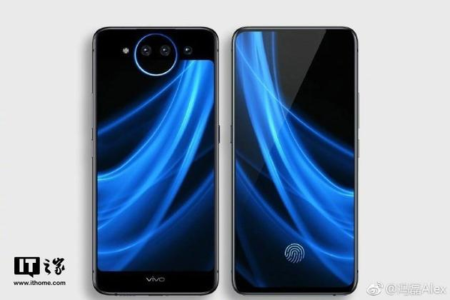 NEX 新机背面采用了水平三摄设计,其中两颗摄像头被一个会发光的“月环”圈住,另外一个摄像头和一颗补光灯在“月环”两侧,正面则是一块完整的全面屏,并且支持屏幕指纹。