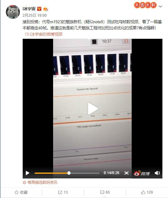 2月25日,微博知名数码博主@i冰宇宙 发布微博称,接到疑似魅族Note 9的帧数测试投稿,其帧数表现相当出人意料。