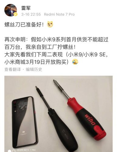 【TechWeb】 雷军昨日发微博称,小米9/小米9 SE将在小米商城3月19日提供开放购买,同时再次申明,假如小米9系列首月供货不能超过百万台,亲自到工厂拧螺丝!