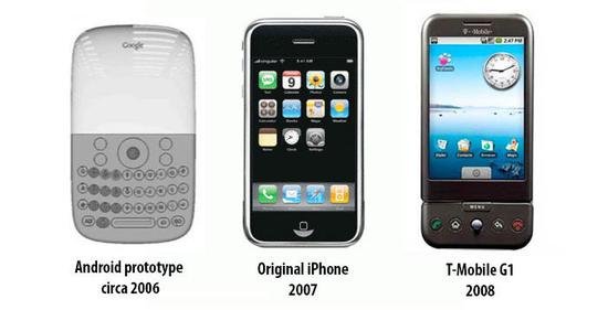 然而,安卓在被Google推向消费市场时,却是不折不扣的iOS跟随者。2007年iPhone和iOS横空出世,全触屏的设计理念震动了整个业界。而在iOS公布之前,安卓是以键盘机为硬件基准而设计的,iOS面世后,安卓受影响作了大刀阔斧的修改,硬生生将系统改成了触屏式。在早期的安卓系统当中,甚至部分功能仍需要键盘才能实现,第一部推向市场的安卓机HTG G1仍带有侧滑式全键盘,就是最好的明证。