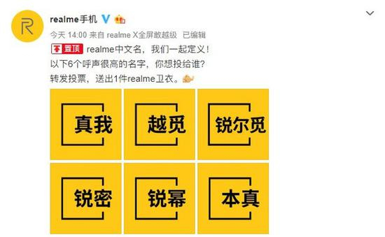 @realme手机为用户提供了真我、越觅、锐尔觅、锐蜜、锐幂、本真六款中文名,其中呼声最高的是“真我”。