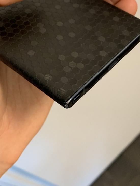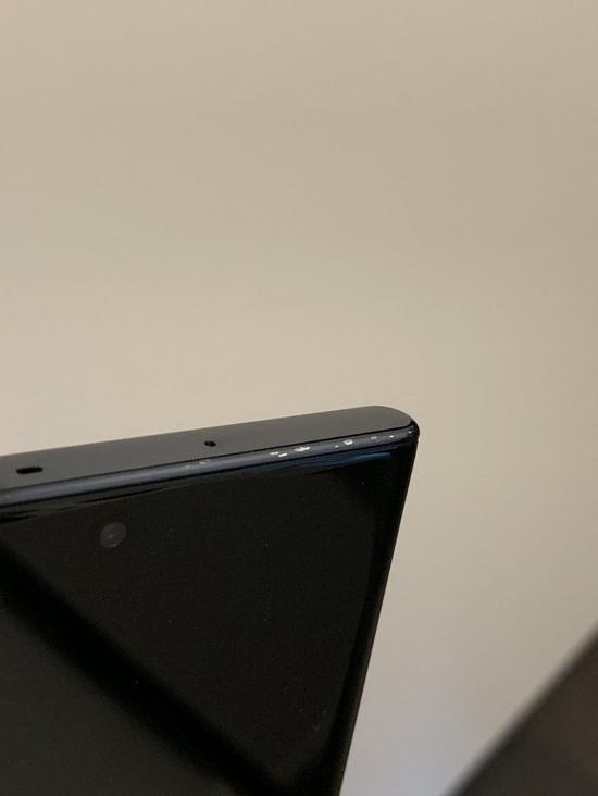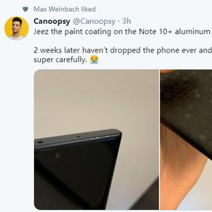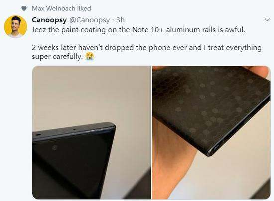 此次“涉事”的手机为一部黑色的三星Galaxy Note 10+。在推文中这位外国网友表示自己一直很小心谨慎地使用自己的三星Galaxy Note 10+但是仍旧发现手机存在边框油漆脱落的现象,而且还是在仅使用了两周的前提下。从图上也可以看出这位网友为自己的爱机贴上了背膜,而手机的上下边框也出现了不同程度的掉漆。