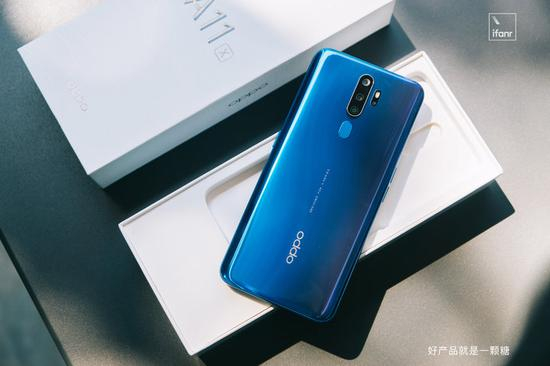 除了这些元素,OPPO A11x 的背面也处理得很干净。我们手上的是慕辰紫配色的 OPPO A11x,机背呈现的是一种蓝、紫过渡的渐变色效果。光影纹路不多,机背随着光线变化会呈现出渐变色变化,配合带镜面处理的机身也有不错的观感。