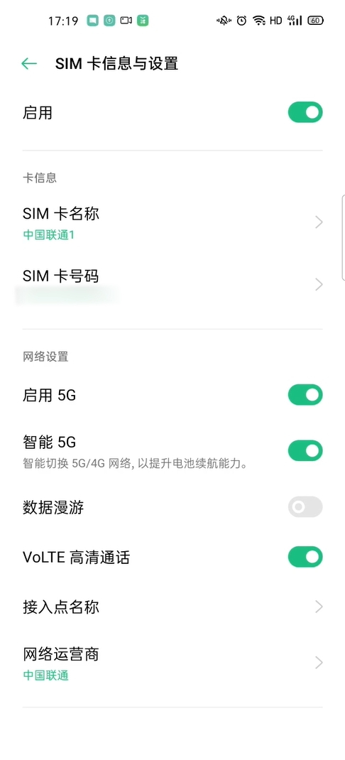 从最新曝光的Reno3系列截图来看,其SIM卡设置信息中,在网络选项中已经出现了5G的身影,用户可以手动勾选启用5G选项,而且系统还提供智能5G选项,即智能切换5G、4G网络。