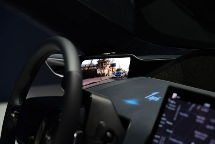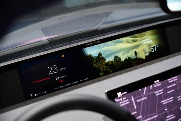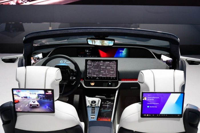 这8个屏幕包括两个侧视镜屏幕、一个以安全的视线水平显示导航信息的前显示屏、一个集成到内部设计中的仪表板显示屏(可以巧妙地提供视觉警报和通知)、一个可以访问各种汽车功能的中央控制台显示屏,一个用户显示车辆主要界面的中央信息屏幕,以及两个物理旋钮,每个都有自己的显示屏,总共有八个。