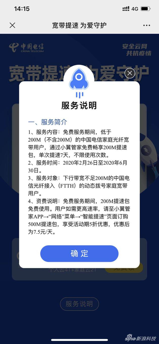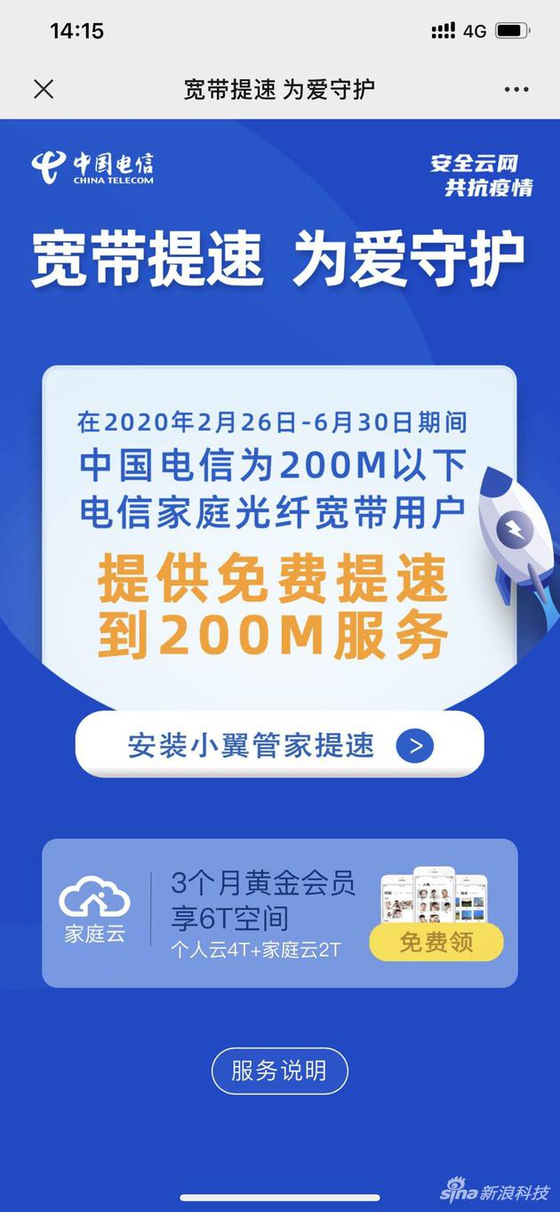 免费服务期间,低于200M(不含200M)的中国电信家庭光纤宽带用户,通过小翼管家免费畅享200M提速包,单次提速7天不限次数。