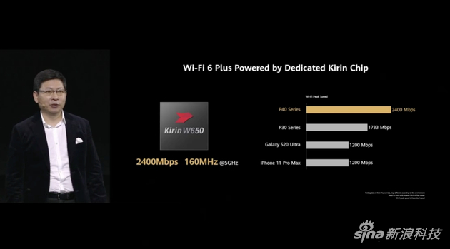 华为消费者业务CEO余承东介绍,华为P40系列可支持WiFi6+技术,从官方公布的数据来看,华为P40系列WiFi6+i峰值速率可达2400Mbps,作为对比,P30系列为1733Mbps,三星S20 Ultra为1200Mbps,而iPhone 11 Pro Max只有1200Mbps。