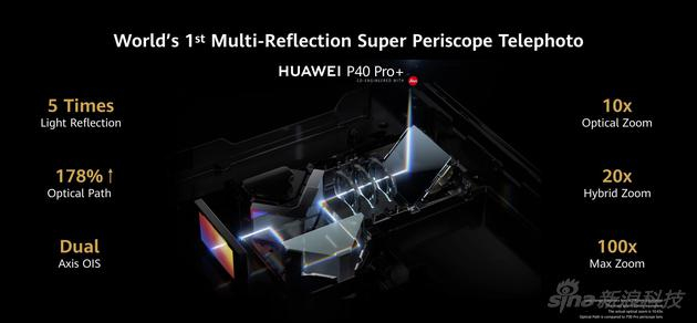 相比于HUAWEI P30 Pro搭载的潜望式长焦摄像头,HUAWEI P40 Pro+潜望式摄像头折射次数是HUAWEI P30 Pro的5倍,光程上提升100%,变焦倍数增加一倍。除此之外还支持OIS防抖+AIS双重防抖。