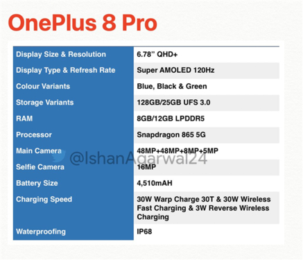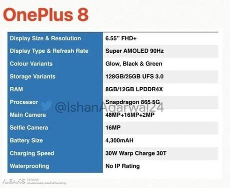 配置上,根据之前爆料,一加8配备一块6.55英寸FHD+ SuperAMOLED屏幕,刷新率高达90Hz;搭载骁龙865移动平台,采用LPDDR4x+UFS 3.0内存组合;拥有4300mAh电池,支持30W闪充;前置1600万像素自拍镜头,后置4800万+1600万+200万像素三摄像头。