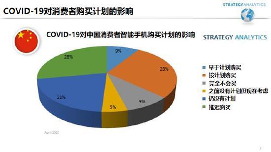 于此同时,Strategy Analytics无线智能手机战略团队基于3月21日至25日对1,300名中国消费者的调查也发布了报告-《中国智能手机:Covid-19疫情后的消费者购买意向》。报告指出,尽管中国人比美国或欧洲的消费者对一切能快速的恢复常态更为乐观,但智能手机换机率和5G的普及无疑已经放缓。主要调研结果包括: