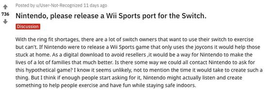 只不过,有的 Switch 玩家不想重新买一台 Wii,但他们也买不到健身环,如今只能抱怨说:‘为什么 Switch 都上市三年了,任天堂还不做一款类似于《Wii Sports》的游戏?’