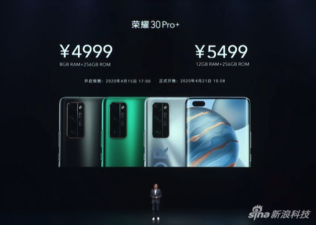 售价方面,荣耀30 6GB+128GB售价2999元,8GB+128GB售价3199元,8GB+256GB售价3499元;荣耀30 Pro 8GB+128GB售价3999元,8GB+256GB售价4399元;荣耀30 Pro+ 8GB+256GB售价4999元,12GB+256GB售价5499元。这三款机型将在4月21日10:08在线上渠道开卖。