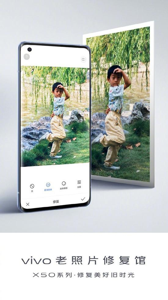 官方公布的消息显示,vivo X50系列配备超清修复功能,可将老照片修复;同时在vivo相册中还可以实现文档去影和照片去路人功能。