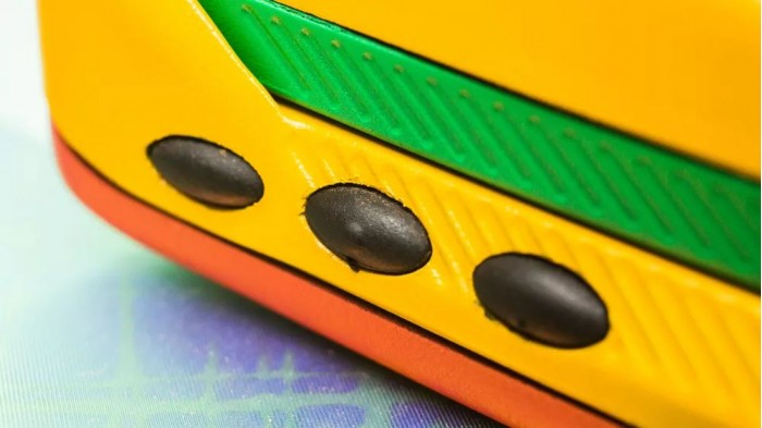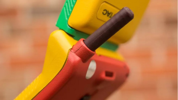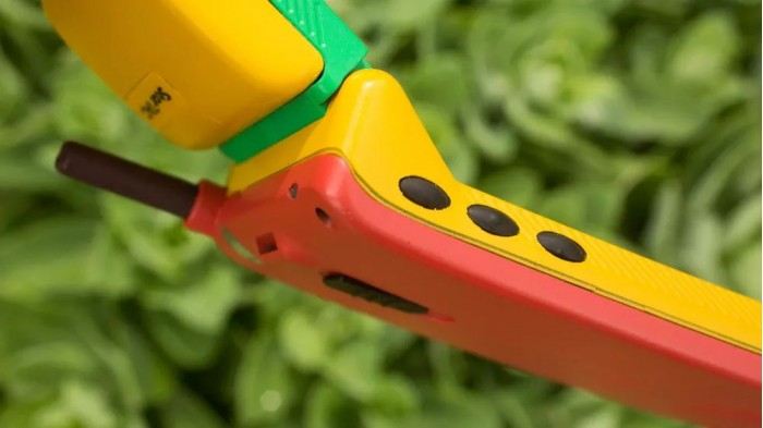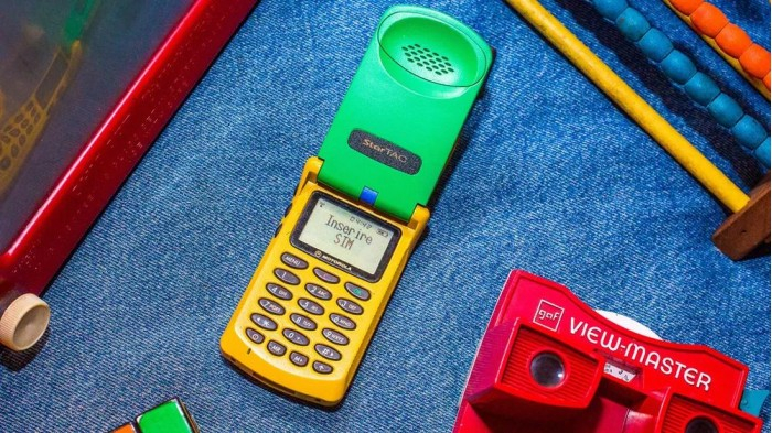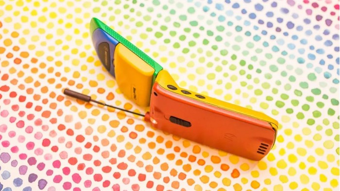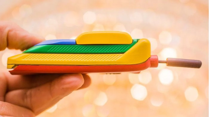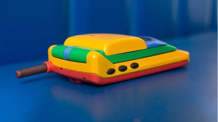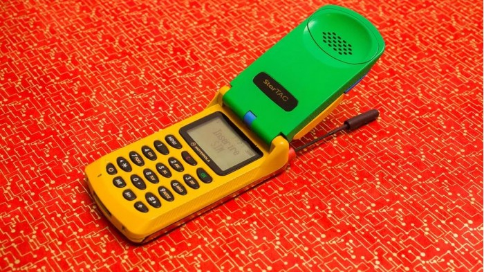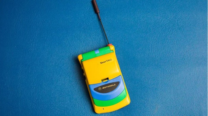 他在 eBay 上淘到了彩虹版摩托罗拉StarTAC,拿到现在来看它就像是一个小孩的塑料玩具,黄色的塑料机身、绿色的屏幕盖以及红色的背面,此外还有一根可以伸缩的天线。
