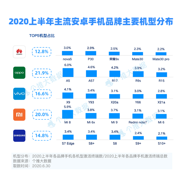 关注完5G手机市场,让我们再跟着数据回顾2020上半年整个安卓智能手机市场概况。
