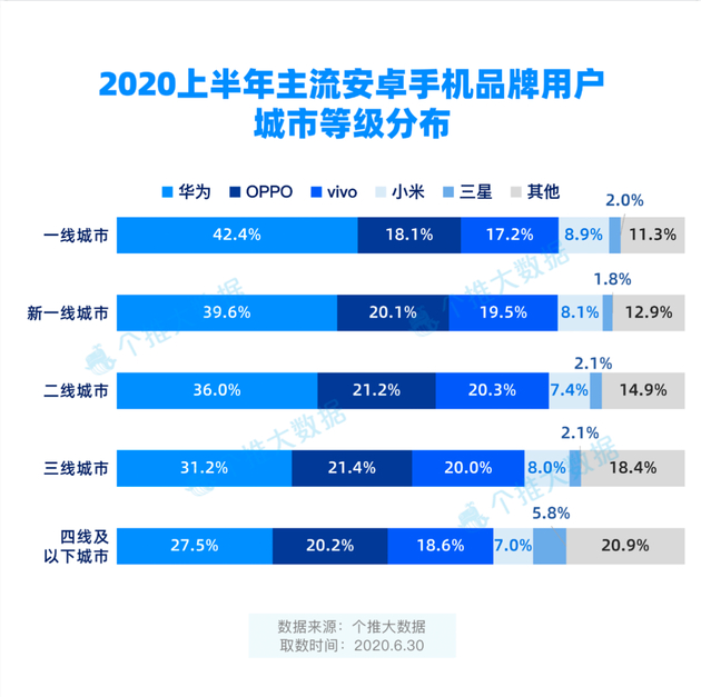 华为手机用户在各等级城市中的占比都处于领先位置,尤其是在一线城市占比高达42.4%,也就是说一线城市有近一半用户在使用华为,显示出华为超强的品牌影响力。OPPO和vivo手机在各线城市的分布较为平均,OV手机在下沉市场依旧稳扎稳打。