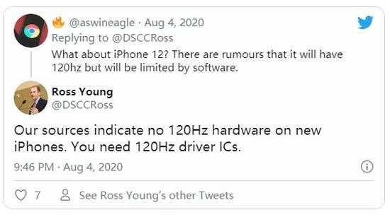 Ross Young 称,他们得到的消息是,苹果 iPhone 12 并没有支持 120Hz 屏幕的硬件,没有 120Hz 驱动 IC。因此 Ross Young 驳斥了此前消息称 iPhone 12 机型理论上可以支持 120Hz 的刷新率,是否启用该功能取决于苹果。