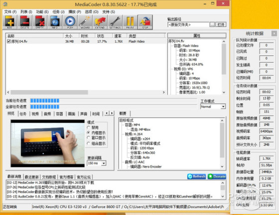 手机或者相机拍出来的视频文件容量很大导致网络传输很慢?其实只要使用“ MediaCoder”这个享誉国内外视频压缩软件,即可将大容量的视频转成原容量十分之一甚至更小的视频文件。例如,4G多的720P高清电影,只要在 MediaCoder里选择的分辨率和视频码率够低,转出来的文件100M都不到也是很正常的事。