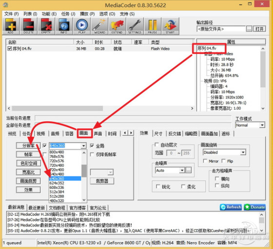 设置视频转换后的分辨率(640*360方便网上两人互传)