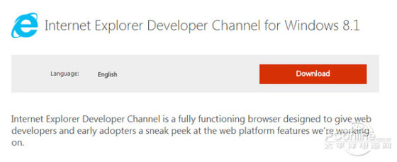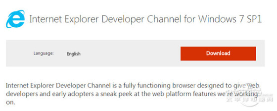 目前,Windows 7、Windows 8.1用户均可下载体验IE开发者渠道版本。IE开发者渠道版可与IE11同时独立运行,不会出现覆盖现有IE11的情况。不过目前IE开发者渠道版仅仅只有英文版,没有中文版。