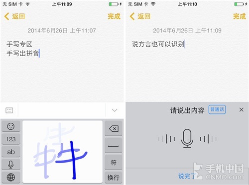 接下来笔者要说的是两个比较新颖的功能,首先笔者为大家说说语音功能,讯飞输入法的语音功能还是非常强大的,是首款支持普通话、越狱、英语、还 有其他地方方言的输入法。在测试版中,用户要点击左上角的切换输入按钮先切换到是手写页面,之后点击左下角的麦克风图标(笔者在这里提醒大家,语音输入是 需要网络支持的),接下来我们就可以对着麦克风说话了。