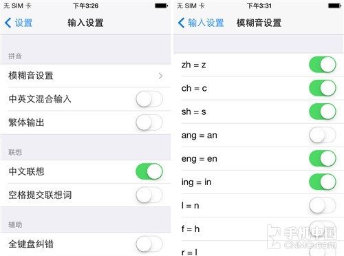 首先笔者为大家介绍一下讯飞输入法的设置界面,打开iPhone手机上讯飞输入法的应用之后,大家可以看到“输入设置”、“键盘设置”、“手写 设置”、“词库管理”、“语音设置”等,从设置菜单上看,键盘、手写、语音这三大讯飞输入法的法宝已经完成适配。首先我们来看看“输入设置”,点击进入之 后我们可以在这里设置模糊音设置、中英文混合输入、中文联想、字频调整等等操作。
