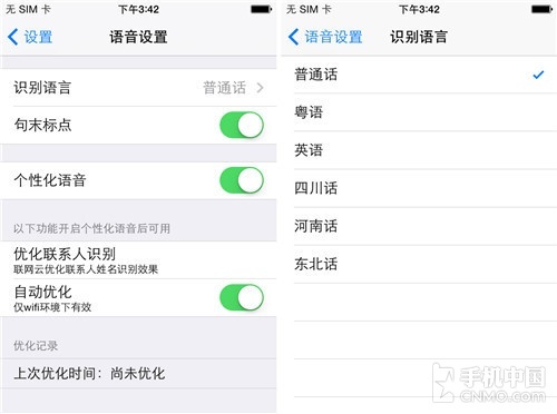 “手写设置”中大家可以调整“抬笔时间”、“笔记粗细”和“笔记颜色”,调整起来也比较简单,用户只需要拖动按钮即可完成操作。最后我们来看看 “语音设置”,点击进入之后,大家可以选择识别语言,目前的版本中提供了普通话、粤语、英语、四川话、河南话和东北话。此外,大家还可以对句末标点、个性 化语音、自动优化等进行更加详细的设置。