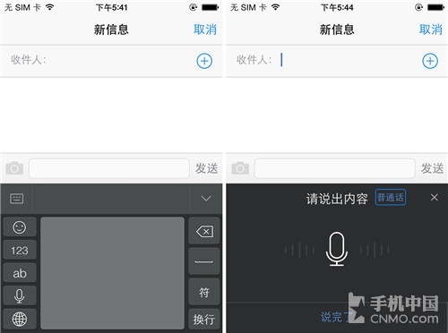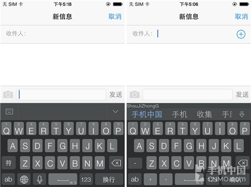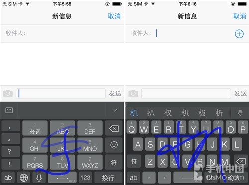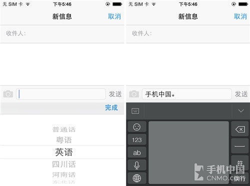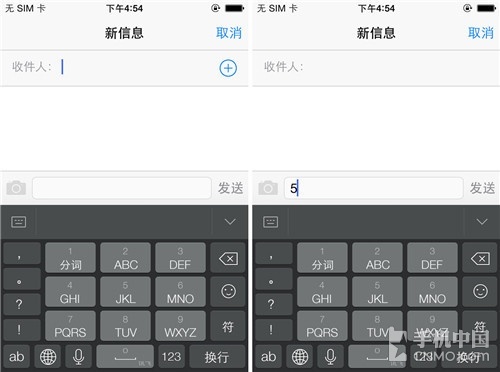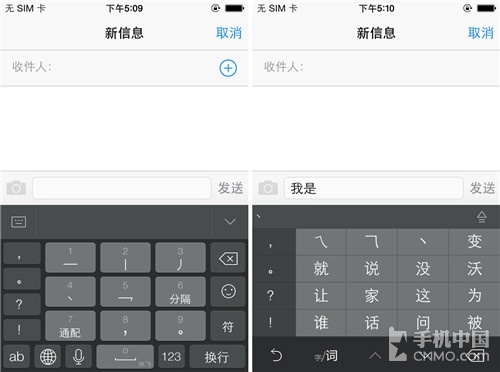 接下来笔者就为大家具体的说说讯飞输入法的使用情况,打开短信界面,这时讯飞输入法会自动弹出,笔者首先尝试的是九宫格输入。从默认状态下看九 宫格界面与目前苹果原生推出的九宫格输入法有些类似,不同的是,字母键上还有数字标注。另外如果用户想输入数字,我们只需要点击键位上的相关输入然后滑动 即可。而正常输入时,笔者认为该输入法的灵敏度还是非常不错,但一些特殊的名词和语句还不能准确的找到。