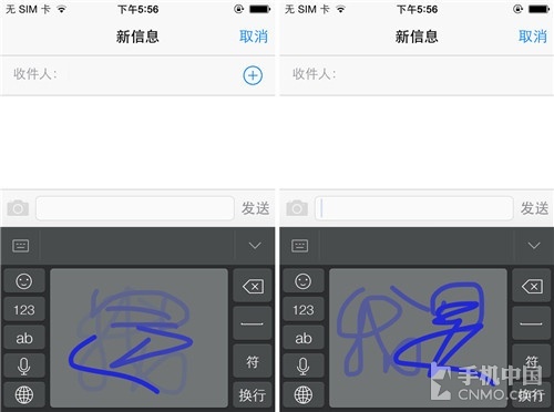 最后笔者要说的就是手写功能了,讯飞输入法的手写功能还是非常强大的,首先讯飞输入法键盘中设置有独立的手写面板,专门用于手写并支持叠写输 入。而当我们切换到手写输入模式后,我们可以正常的输入文字,也可以连续写好几个字,并且还可以在一个字写完之后立刻叠加在字上继续写。此外,我们还可以 在九宫格和26键界面上手写,非常智能。