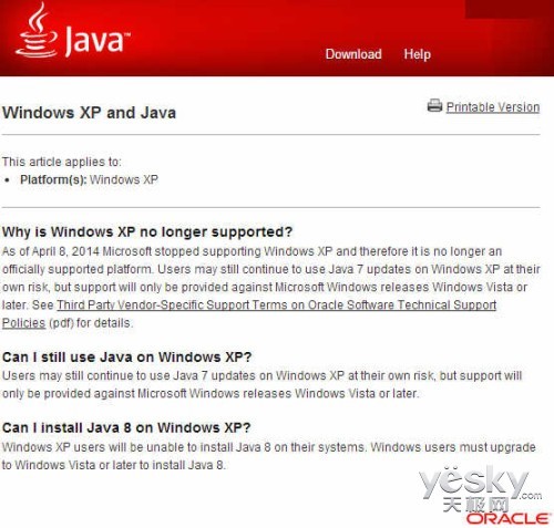 甲骨文Java美国官网介绍称,由于微软从4月8日起正式放弃Windows XP平台,强制要求XP用户升级至更高的桌面平台,提升系统的安全性。为此,从Java 8起,Java将正式放弃Windows XP平台,当然也不支持安装运行。这也意味着Java 8仅支持Vista、Win7、Win8.1等更高平台。