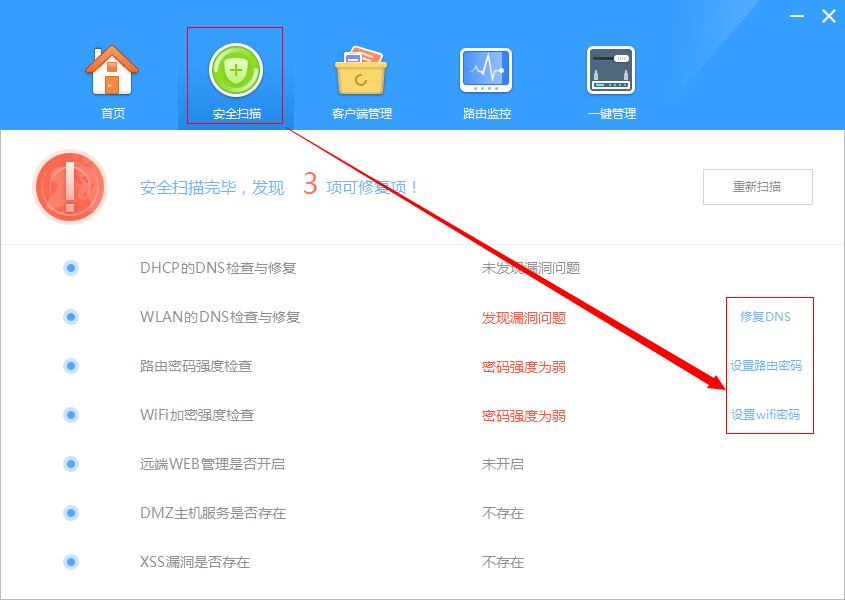 图11:在瑞星路由安全卫士的安全扫描功能中,可以对路由进行全方面的体检,发现风险