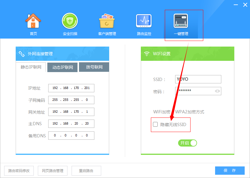 图10:瑞星路由安全卫士的一键管理功能里直接可以选择关闭SSID