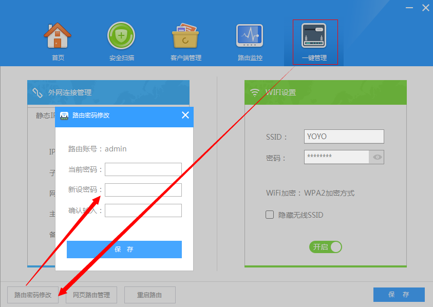 打开瑞星路由安全卫士主界面,然后点击“一键管理”——点击左下角的“路由密码修改”,然后就可以把全国皆知的admin/admin密码修改掉了。