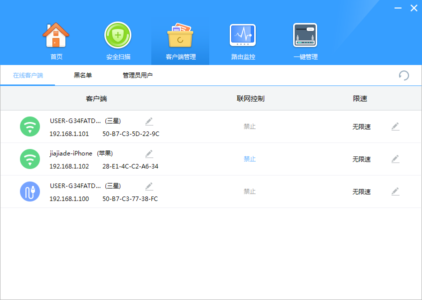 安装了瑞星路由安全卫士后,首先进行常规配置,把路由器的管理账号密码输入后,点击“客户端管理”,然后就可以看到所有已连接的设备,在这里可以随意踢出、拉黑、限速。当然,只要你开着监控,当新的设备连接你的WiFi时,软件会自动弹出提示,你只需要允许或拒绝就行了。