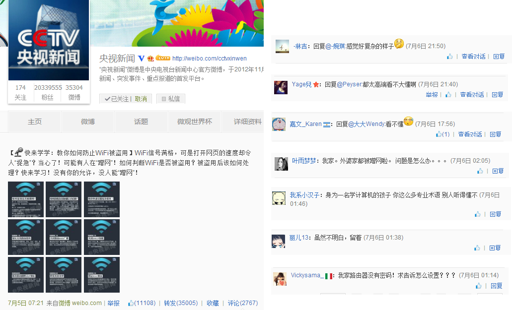 图1:央视新闻在微博上给出的防蹭网技巧,很多人表示看不懂