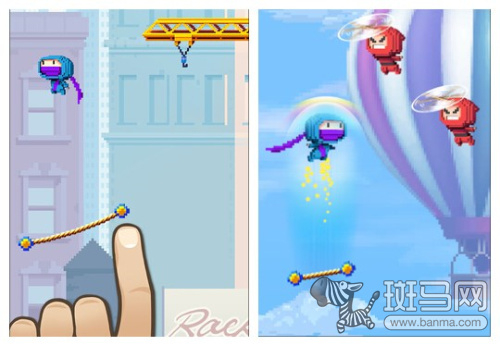 《忍者跳跳跳》游戏玩法非常简单,忍者不断向上跳跃,我们要做的是用手指画出一个弹簧绳,使忍者不断向上。在向上跳跃的过程中,要注意躲避固定的障碍物和移动的障碍物,要是不小心碰到了障碍或者没有猜到弹簧绳,那就game over。《忍者跳跳跳》融合了《悟空蹦蹦蹦2》和《忍者跳跃》等休闲游戏元素,超级耐玩,要是大家撸腻了动作玩烂了卡牌,不妨试试《忍者跳跳跳》。