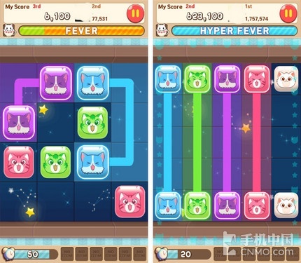 配对砰玩法与连连看完全一致,将同一颜色的猫咪用直线相连接即可消除,不过屏幕的空间有限,连接线是不能碰到一起的,随着游戏的深入猫咪也越来越多,这下就要考验玩家的对路线的把控了。