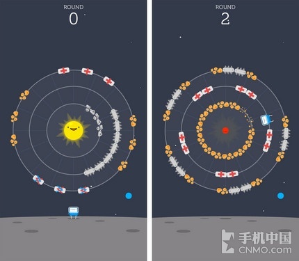 《Ring Rush》的游戏方法非常简单,由于太阳被障碍物层层包裹,太空人很难接近,但是百密一疏,每层障碍之中都会留有一个小小的缝隙,玩家需要看准时机轻点屏 幕,好让太空人跳上旋转中障碍物转盘。不过请玩家抓紧时间,太阳公公可坚持不了多久,如果在太空人抵达之前火焰就熄灭的话,那么太阳就会爆炸,任务也就失 败了,但是小编发现,再来一次的话游戏画面将会出现更改,也就是说您玩到的所有关卡都是随机出现的。