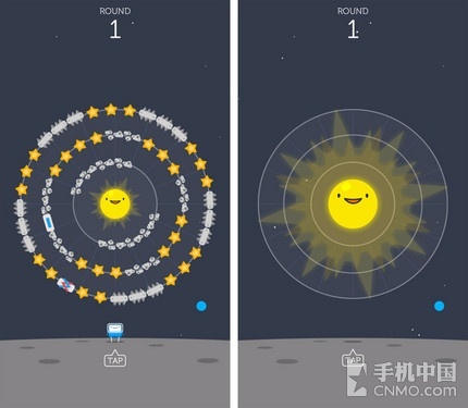 在障碍物转盘上的也不完全都是致命的陨石,也会出现闪烁的星星和蓝色的减号和红色的加号等等,一旦碰上也许会出现从未有过的状况,比如说转盘速 度会突然变慢,方便玩家准确的跳跃,不过太阳的燃烧速度也会加快。但是遇到星星可就太好了,因为那是太阳公公的补给养料,每碰到一次就会延长太阳燃烧的时 间。