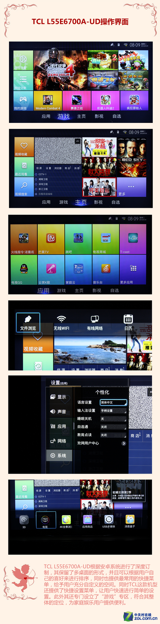 TCL L55E6700A- UD根据安卓系统进行了深度订制,其保留了多桌面的形式,并且可以根据用户自己的喜好来进行排序,同时也提供最常用的快捷菜单,给予用户充分自定义的空 间。同时TCL这款机型还提供了快捷设置菜单,让用户快速进行简单的设置。此外其还专门设立了“游戏”专区,符合其整体的定位,为家庭娱乐用户提供便利。