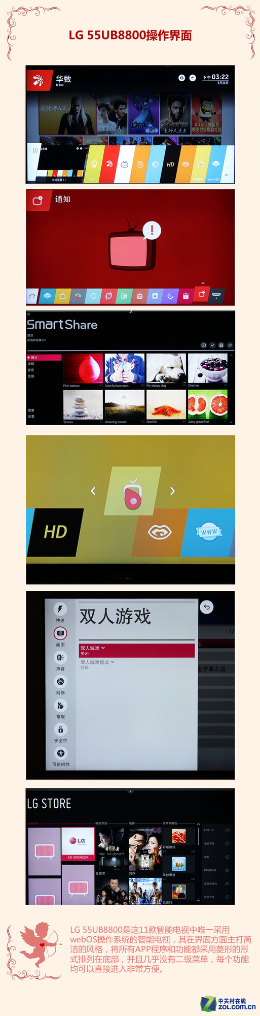 在上文中,我们已经介绍影响智能电视操作体验几个关键的要素是控制界面、菜单结构、操作的流畅性以及遥控器设计,下面我们就从这几个方面来对这11款智能电视进行详细对比介绍。首先我们来看看它们的基本菜单界面对比,首先是LG 55UB8800。