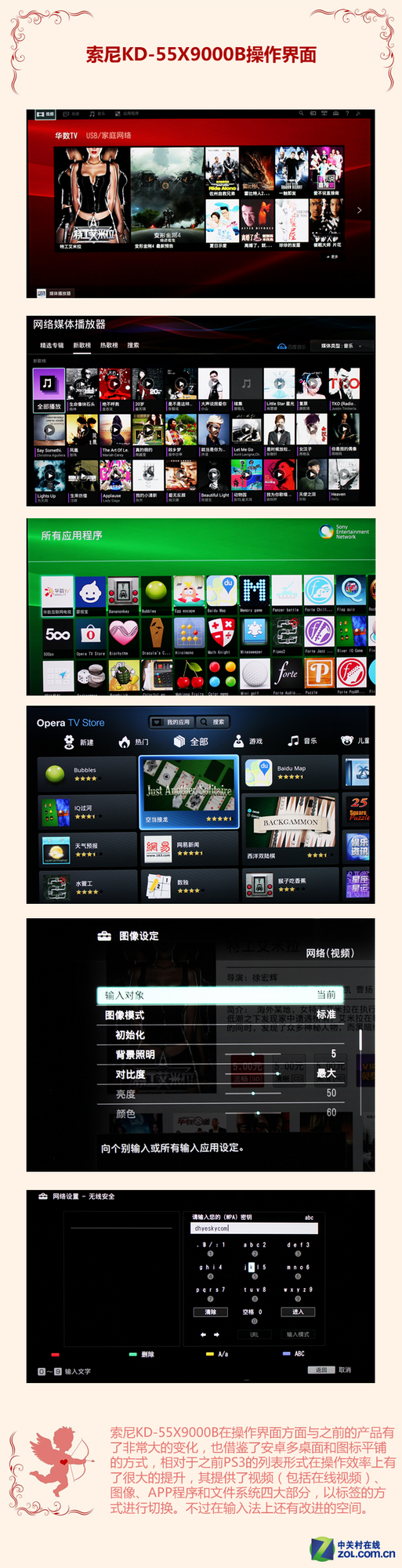 索 尼KD-55X9000B在操作界面方面与之前的产品有了非常大的变化,也借鉴了安卓多桌面和图标平铺的方式,相对于之前PS3的列表形式在操作效率上有 了很大的提升,其提供了视频(包括在线视频)、图像、APP程序和文件系统四大部分,以标签的方式进行切换。不过在输入法上还有改进的空间。其在遥控器设 计方面有了一定的革新,加入了触摸板,并且强调社交功能。
