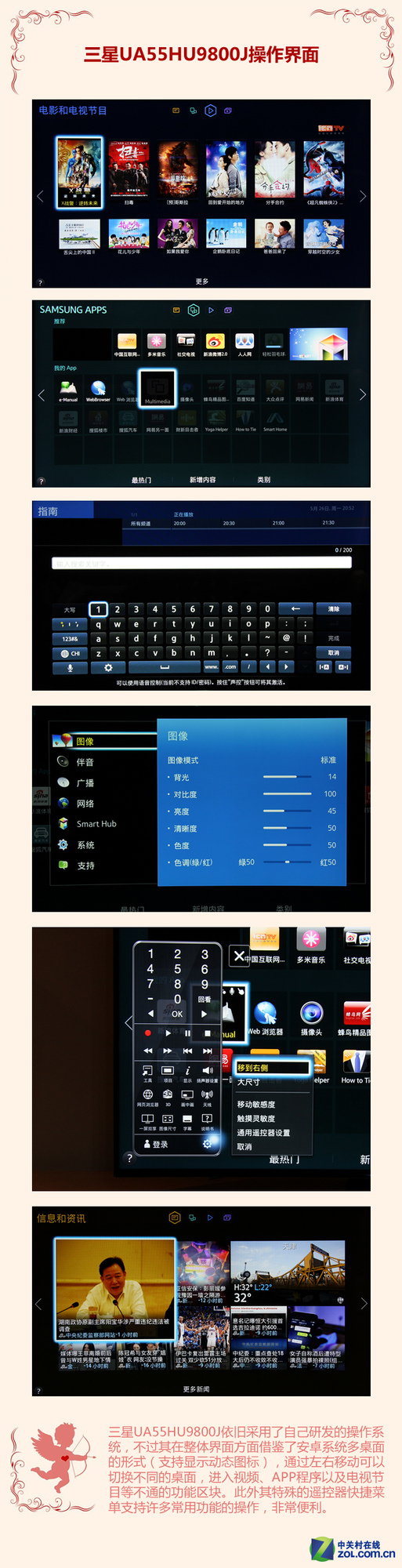 三 星UA55HU9800J依旧采用了自己研发的操作系统,不过其在整体界面方面借鉴了安卓系统多桌面的形式(支持显示动态图标),通过左右移动可以切换不 同的桌面,进入视频、APP程序以及电视节目等不通的功能区块。此外其特殊的遥控器快捷菜单支持许多常用功能的操作,非常便利。结合其最新推出的空鼠遥控 器,要比之前的触摸板操控更加快捷。此外三星新推出的空鼠遥控器不论是准确性还是灵敏性的表现都非常优异,是目前体验最好的空鼠遥控器产品。