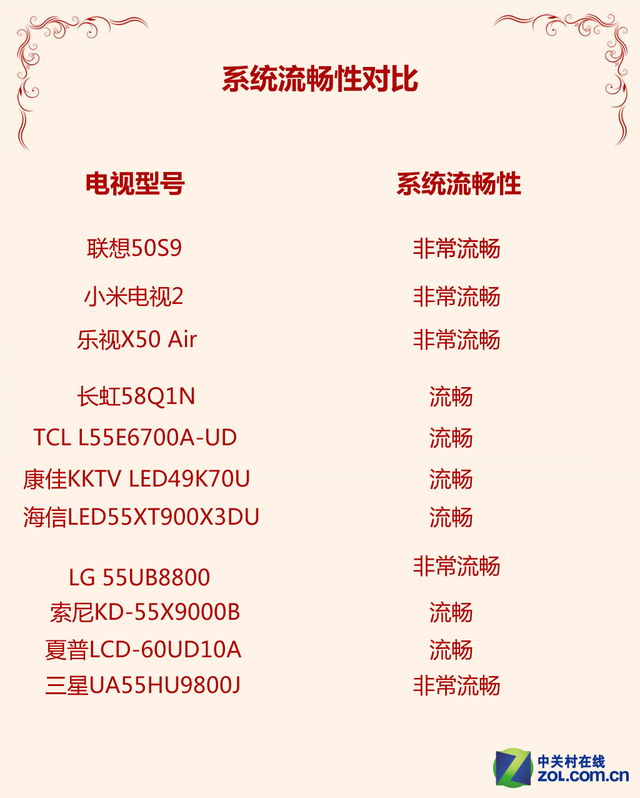 由 于整体硬件性能的大幅度提升,另外各大电视厂商对系统的优化也有了更多的经验,因此在硬件与软件架构同时升级的情况下,现在智能电视的流畅性相对于以往机 型而言有了很大的进步,基本上不存在非常卡顿的情况。而在系统优化足够好的情况下,三星UA55HU9800J、LG 55UB8800、小米电视2、乐 视TV X50 Air和联想50S9都是都是非常流畅的。