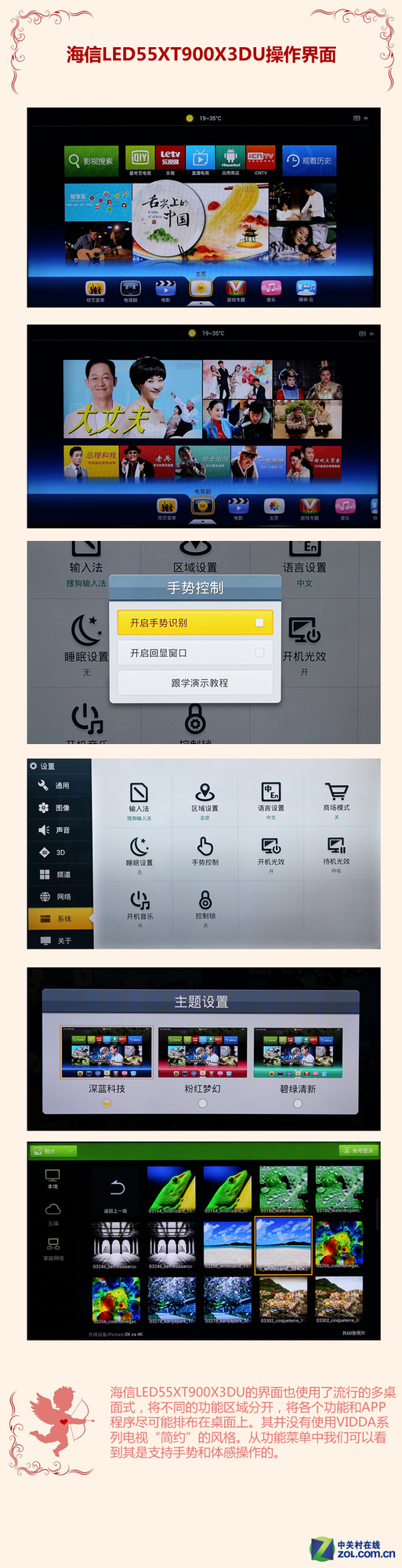 海信LED55XT900X3DU的界面也使用了流行的多桌面式,将不同的功能区域分开,将各个功能和APP程序尽可能排布在桌面上。其并没有使用VIDDA系列电视“简约”的风格。从功能菜单中我们可以看到其是支持手势和体感操作的。